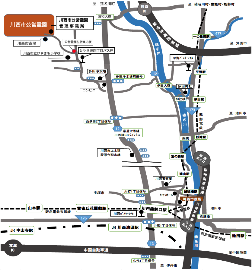 - 阪神高速道路小花出口から国道176号線を西へ 小花1丁目信号を右折。川西能勢口駅から約15分 川西篠山バイパスを北上。多田浄水場前信号を左折して約2km
